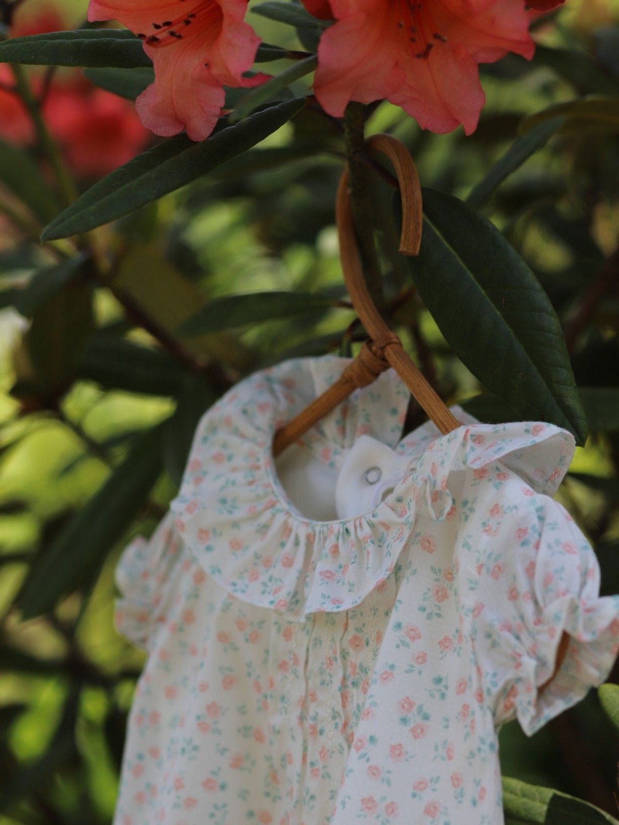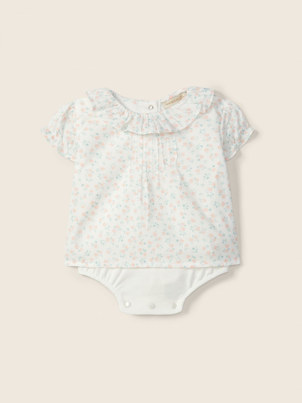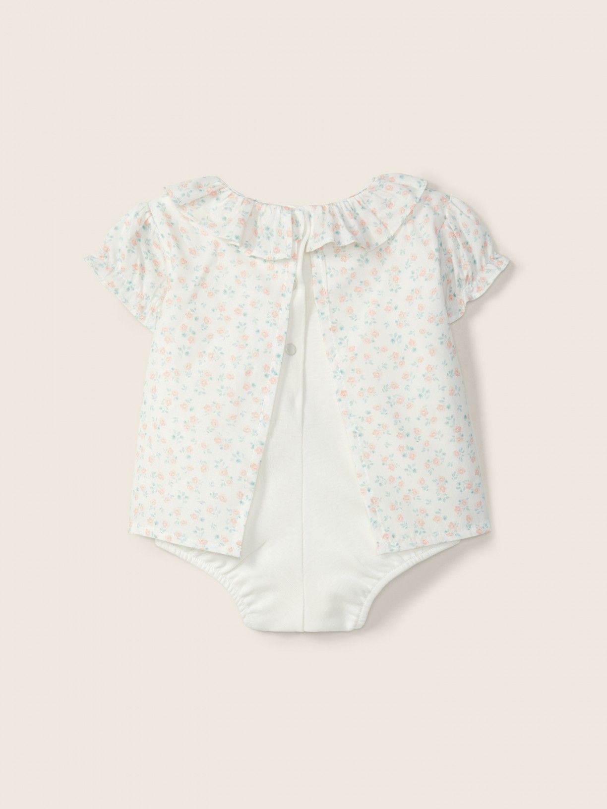 A blusa de manga curta BOUNDLESS LOVE produzida em tecido de algodão suave, com um delicado estampado de flores rosas ou azuis, em fundo pérola, tem o body integrado, produzido em malha branca de algodão leve.