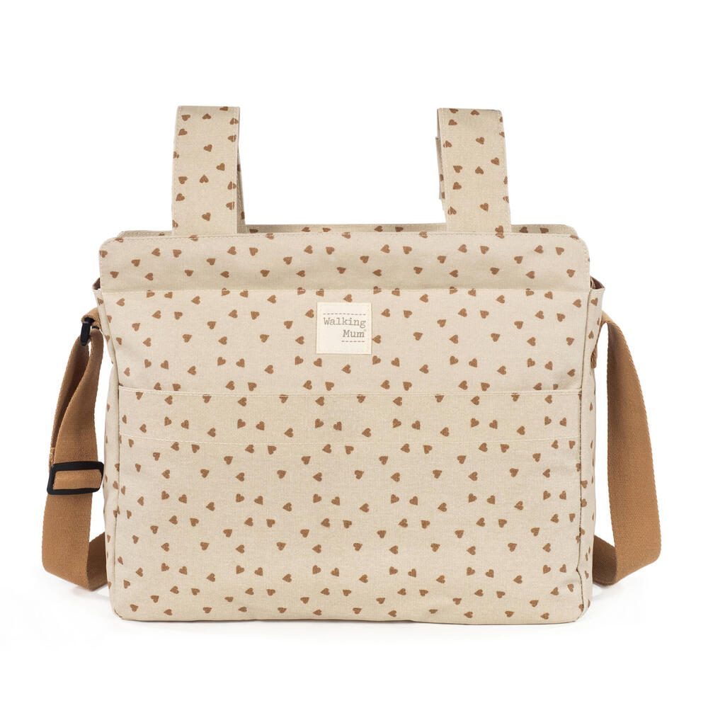 Bolsa de Passeio Hearts Poppy CInnamon da Walking Mum com padrão corações cor canela em fundo bege.