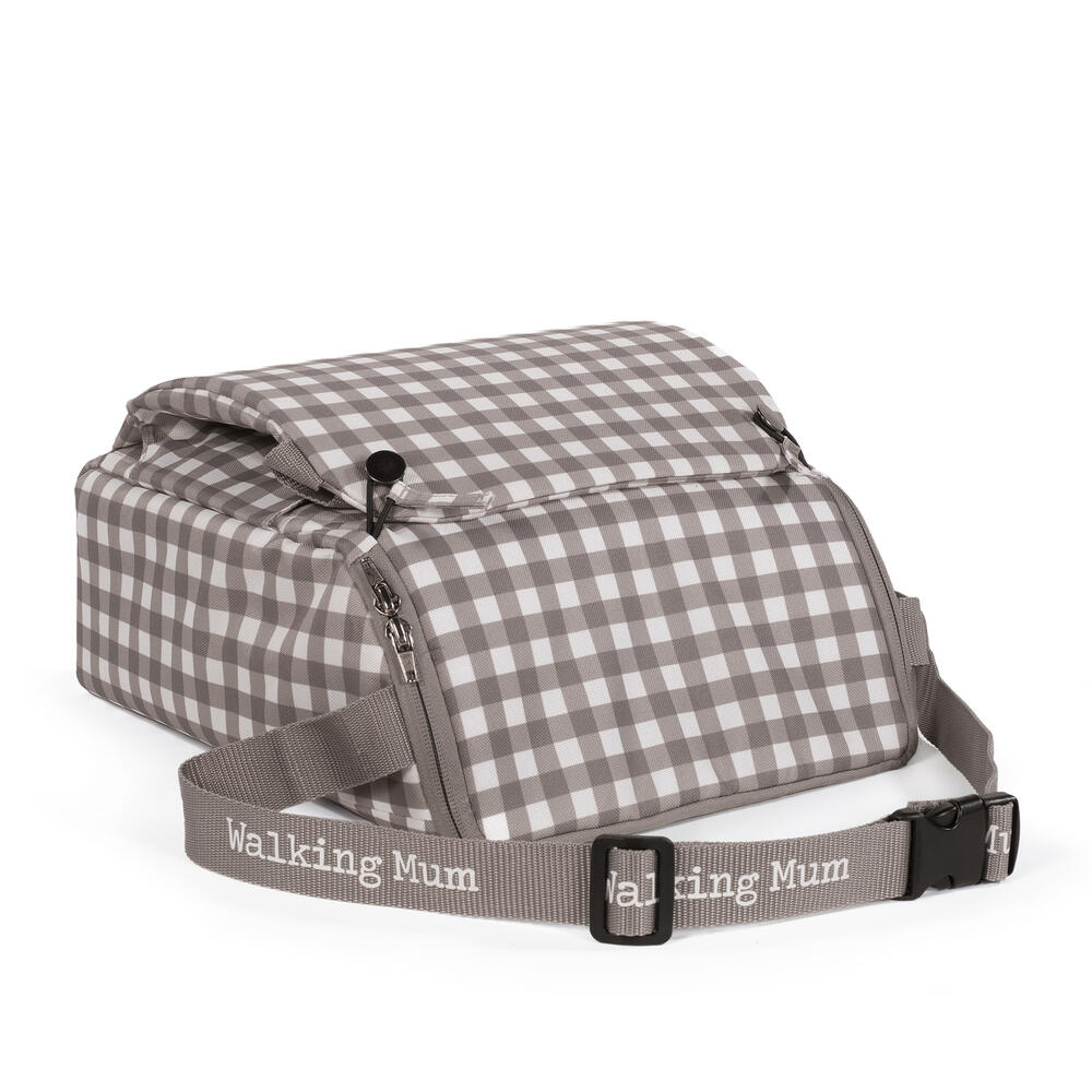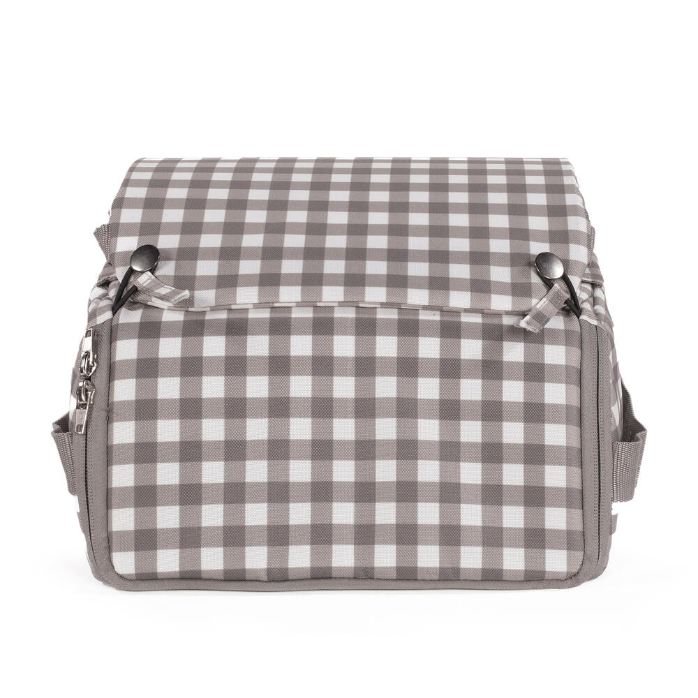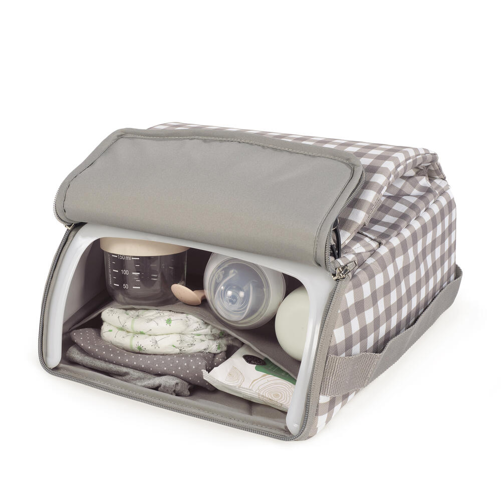 Com um design xadrez moderno em tons neutros, esta cadeira alta elegante e funcional é a solução perfeita para alimentar o seu bebé em movimento.