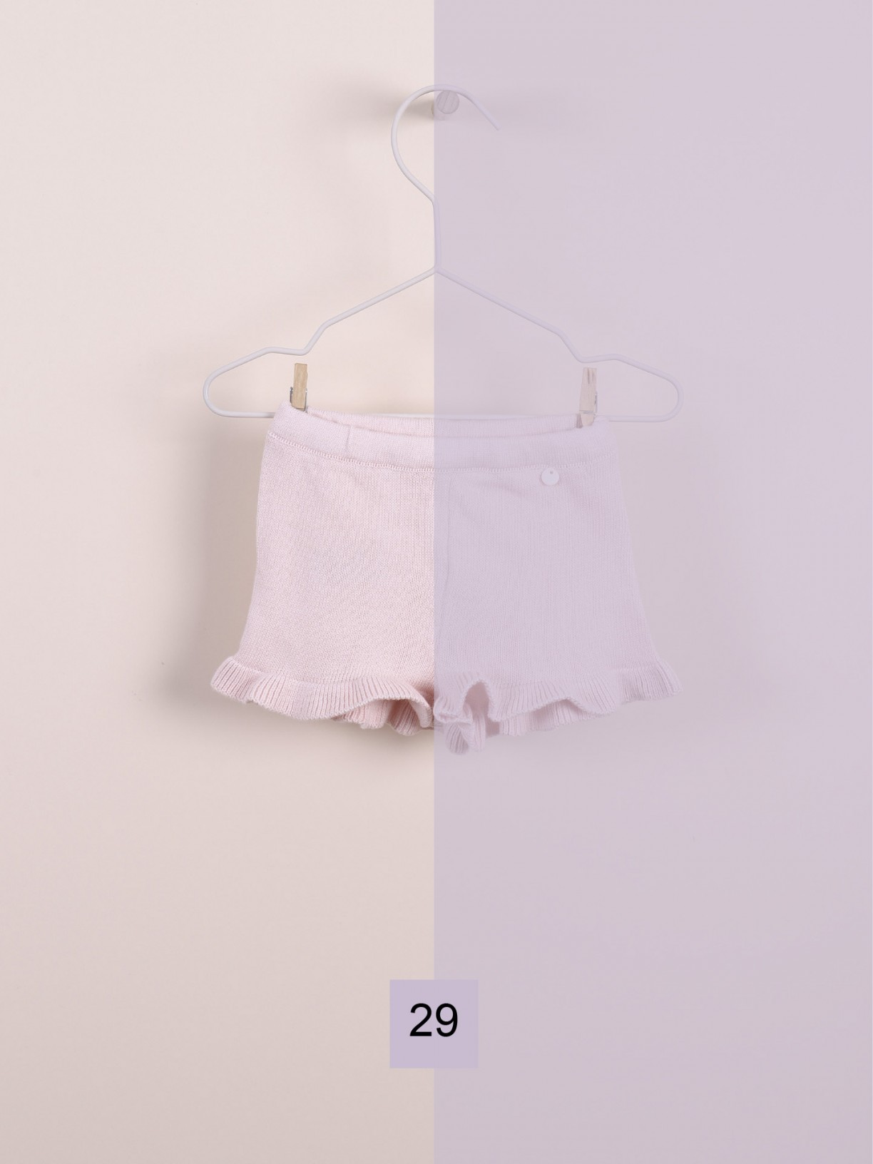 Calções BREEZE com folhos nas pernas tricotados em malha de algodão orgânico suave (exceto as cores camel, bege escuro e verde seco, que são produzidas em algodão leve), ideais para bebés meninos e meninas, até aos 4 anos.