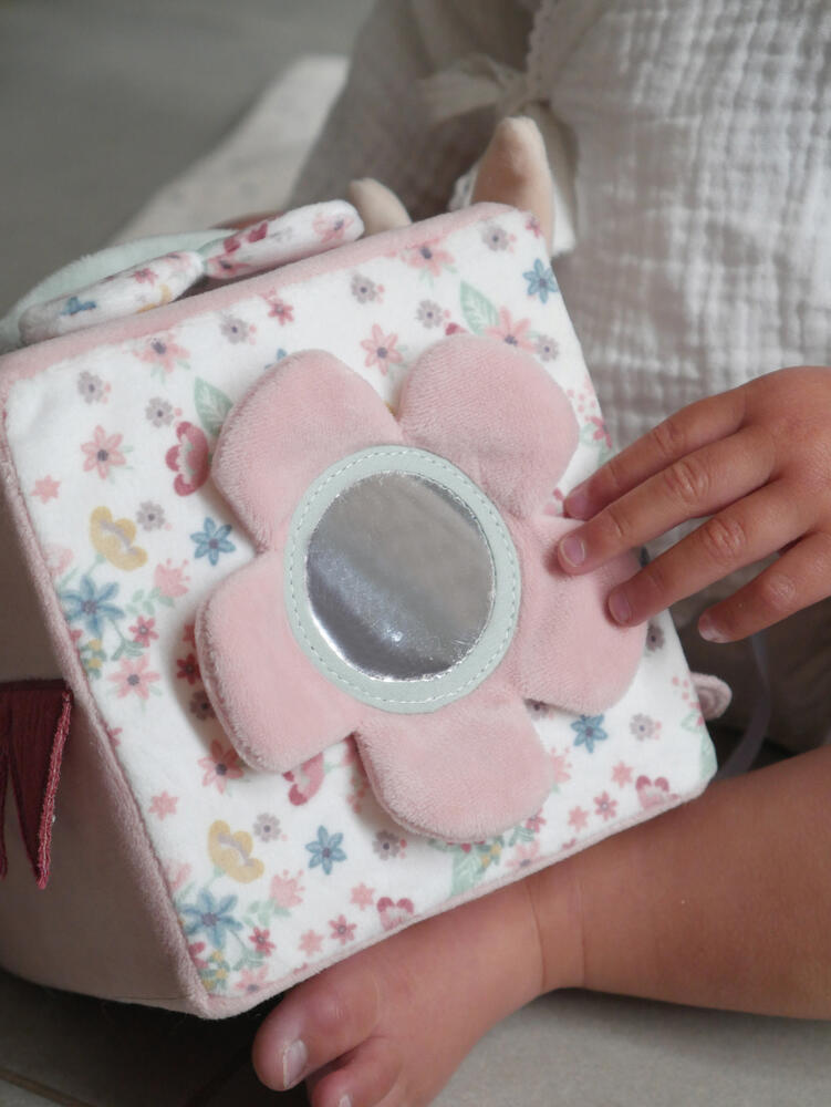 Cubo de atividade macio com coelhinho bege da Coleção Garden para estimular o bebé durante as brincadeiras. Tocar e descobrir diferentes toques e sons, estimula os sentidos e a parte sensorial com diferentes texturas e formatos. Este cubo de atividades também tem um espelho para autodescoberta.