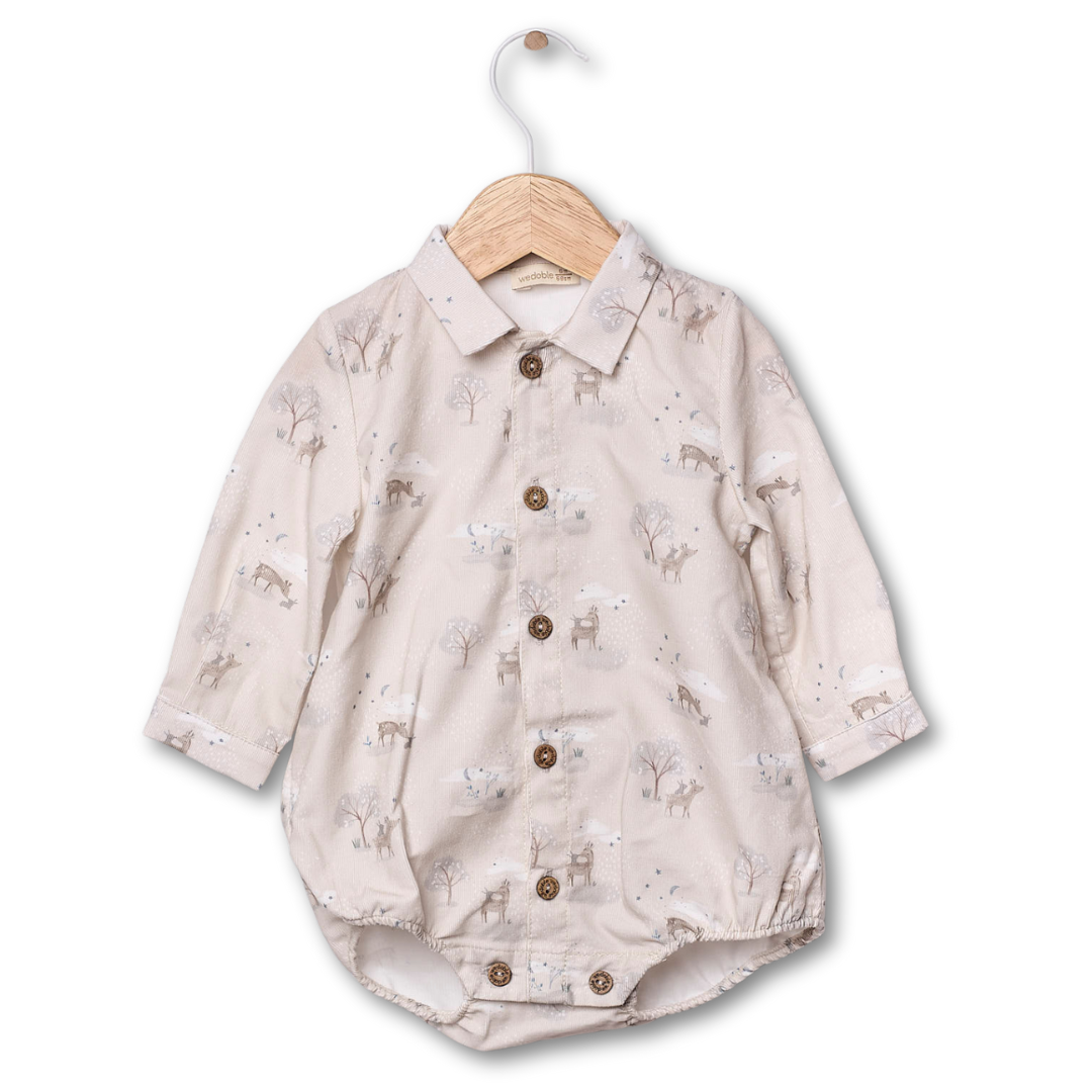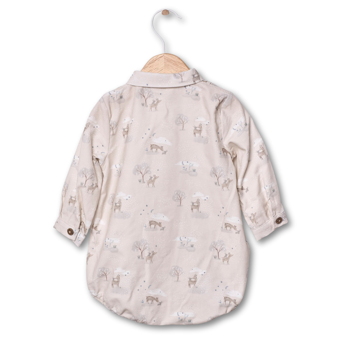 O fofo de bombazine BUNNY AND FRIENDS é produzido em algodão com amorosos animais da floresta, e aperta na frente e entre as pernas com botões de côco.