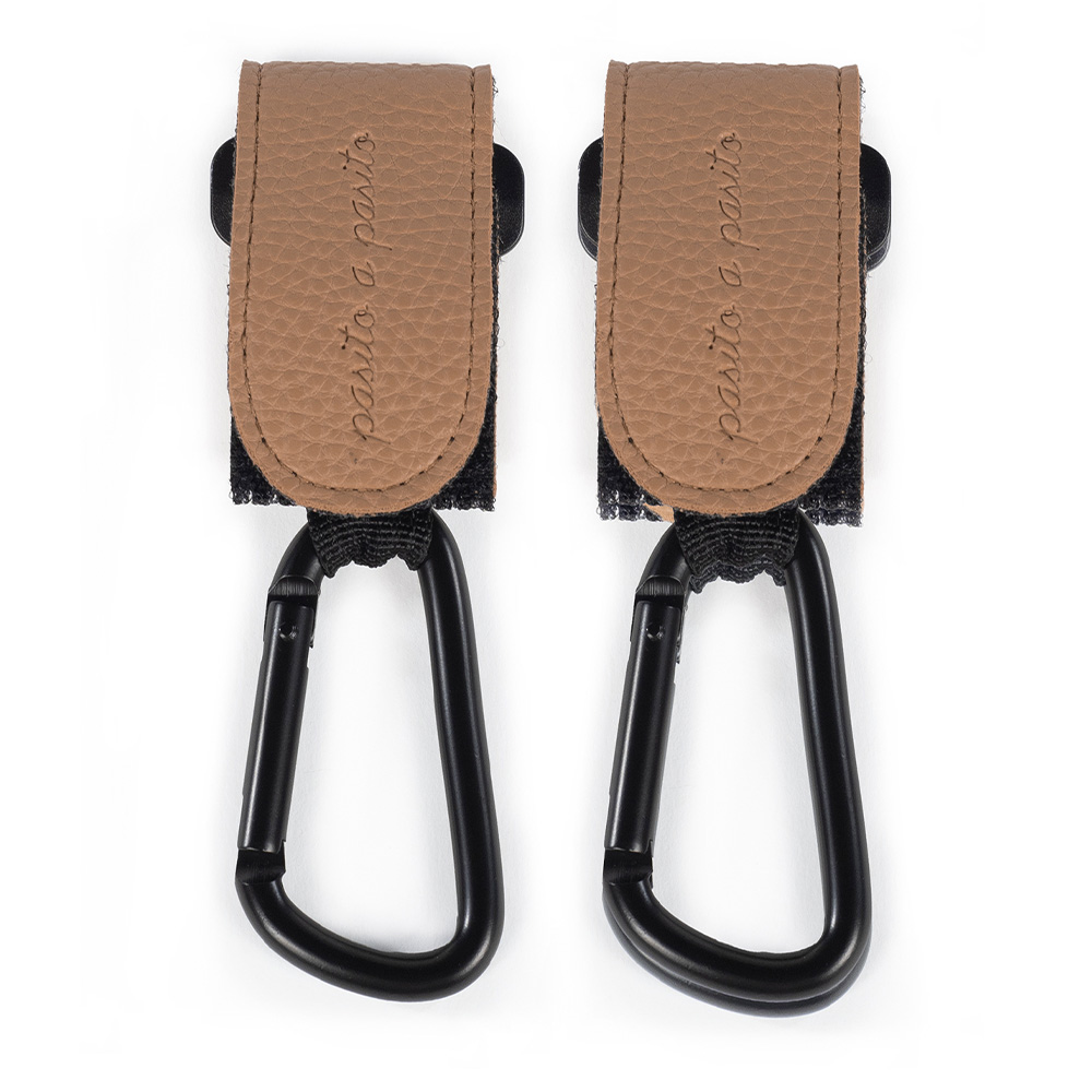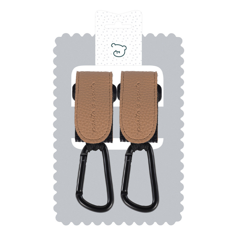 Set 2 Ganchos Pasito a Pasito Icon Caramel– Conjunto de 2 ganchos para carrinho de bebé Icon em ecopele. Gancho metálico. Muito fácil de fixar graças às suas tiras de velcro.