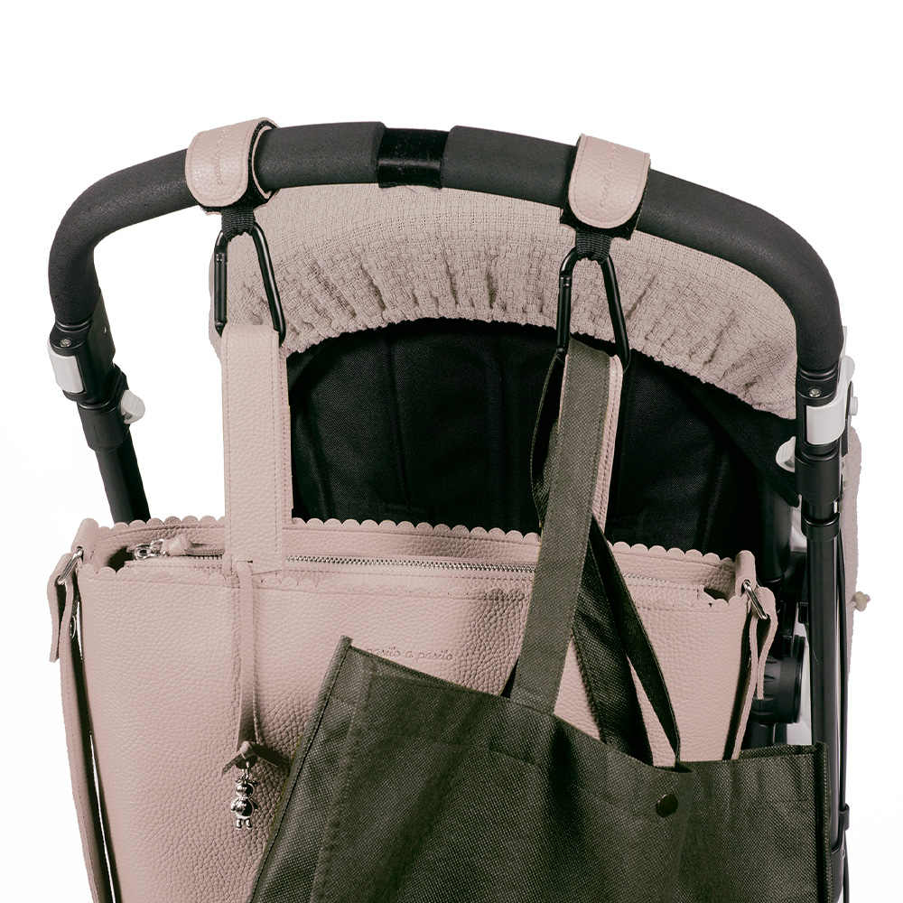 Conjunto de 2 ganchos para carrinho de bebé Icon em ecopele. Gancho metálico. Muito fácil de fixar graças às suas tiras de velcro.