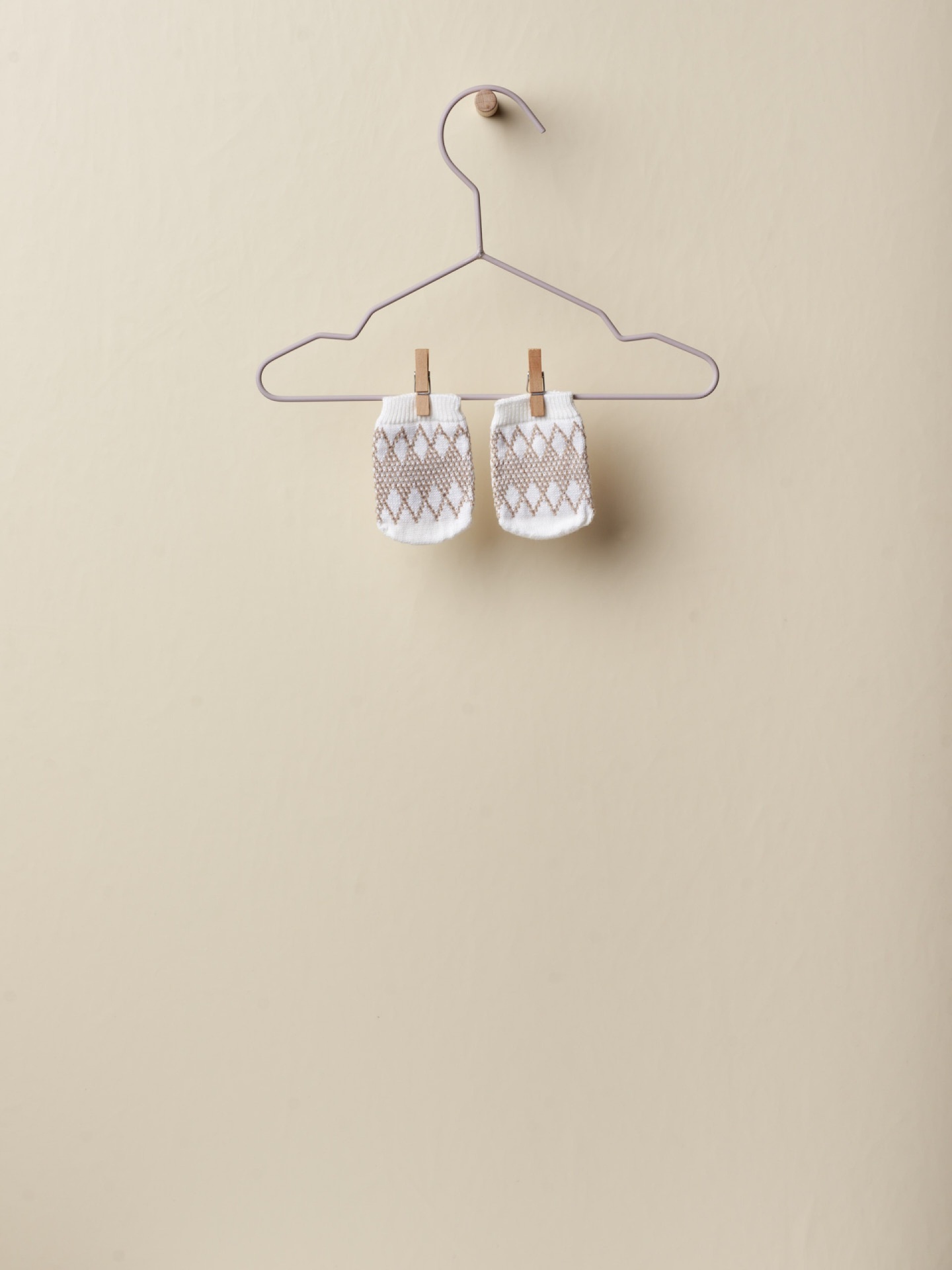 Luvas Mother´s Love tricotadas em malha fina de algodão orgânico, suave e respirável, ideais para bebés recém nascidos, meninos e meninas, até aos 24 meses.