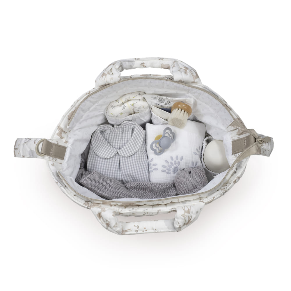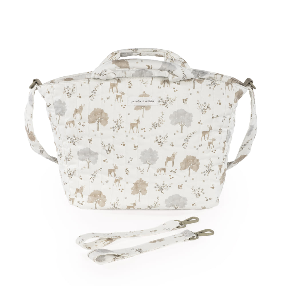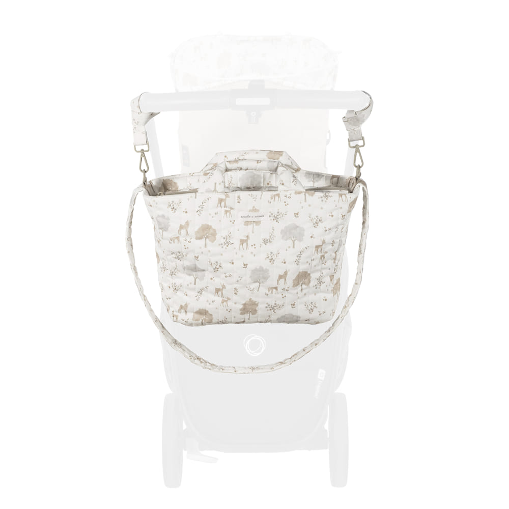 A mala de carrinho de bebé Nara da Pasito a pasito é um modelo único, feito de lona 100% algodão com uma delicada estampado de veados e árvores em tons neutros.