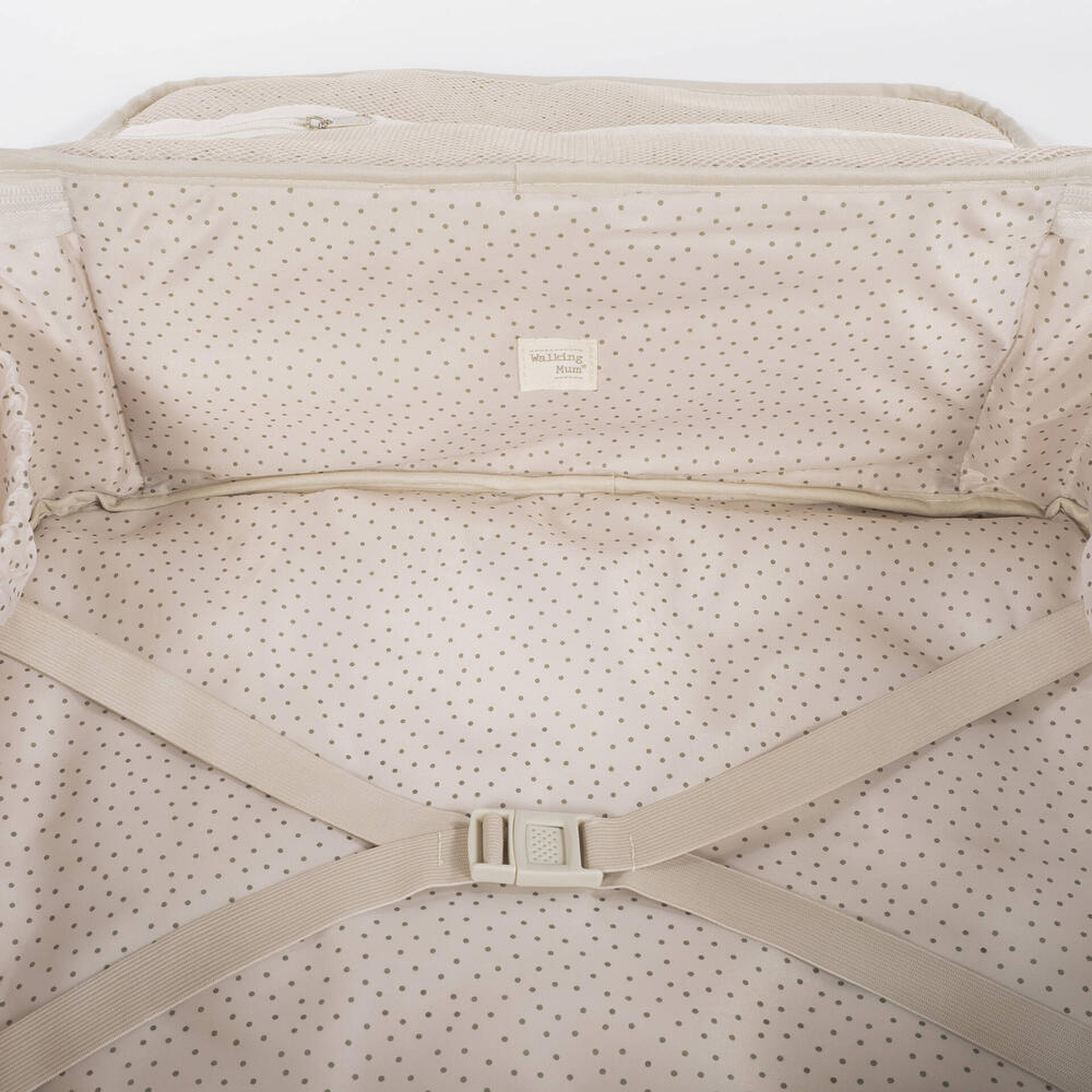 A Mala de Maternidade Walking Mum Polka Dot Poppy Moss pesa 0,730kg, o que a torna prática e fácil de transportar. Possui duas alças de mão para ser carregada confortavelmente e uma alça tiracolo ajustável para ser usada ao ombro. No interior, conta com um bolso com rede e dois bolsos laterais, oferecendo assim um amplo espaço para organizar todos os artigos do bebé. Na sua base contém um sistema de elásticos para manter as roupas no lugar e evitar que se misturem ou amarrotem.