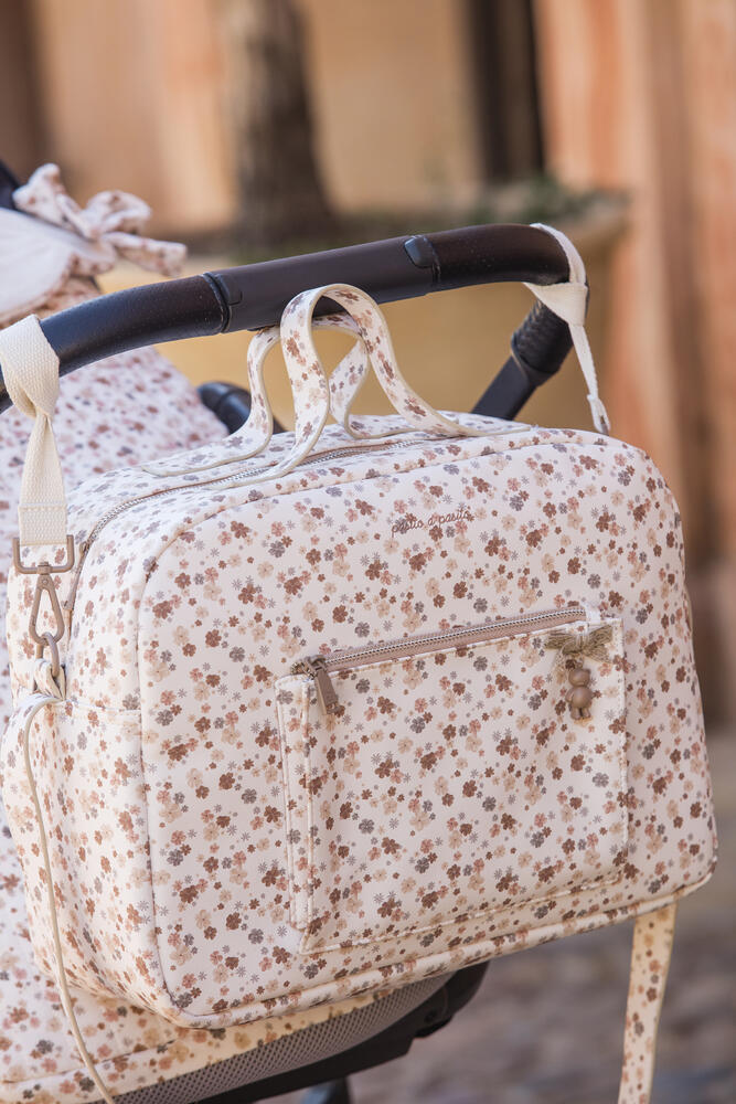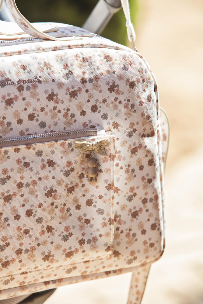 Elegante mala de maternidade em polipele branca com padrão floral composta por diversos e práticos compartimentos para organizar os essenciais da bebé.