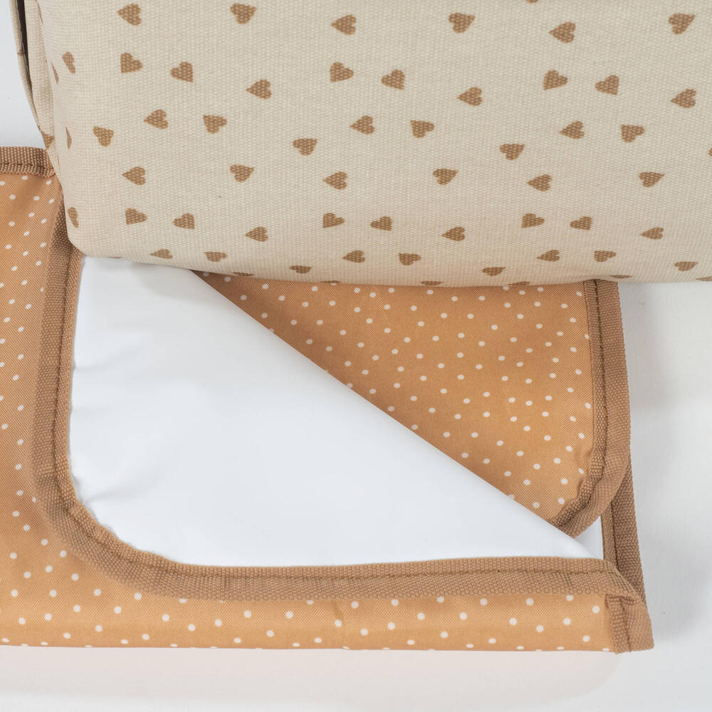 Mochila de Maternidade Hearts Poppy Cinnamon da Walking Mum bege com padrão corações em cor canela.