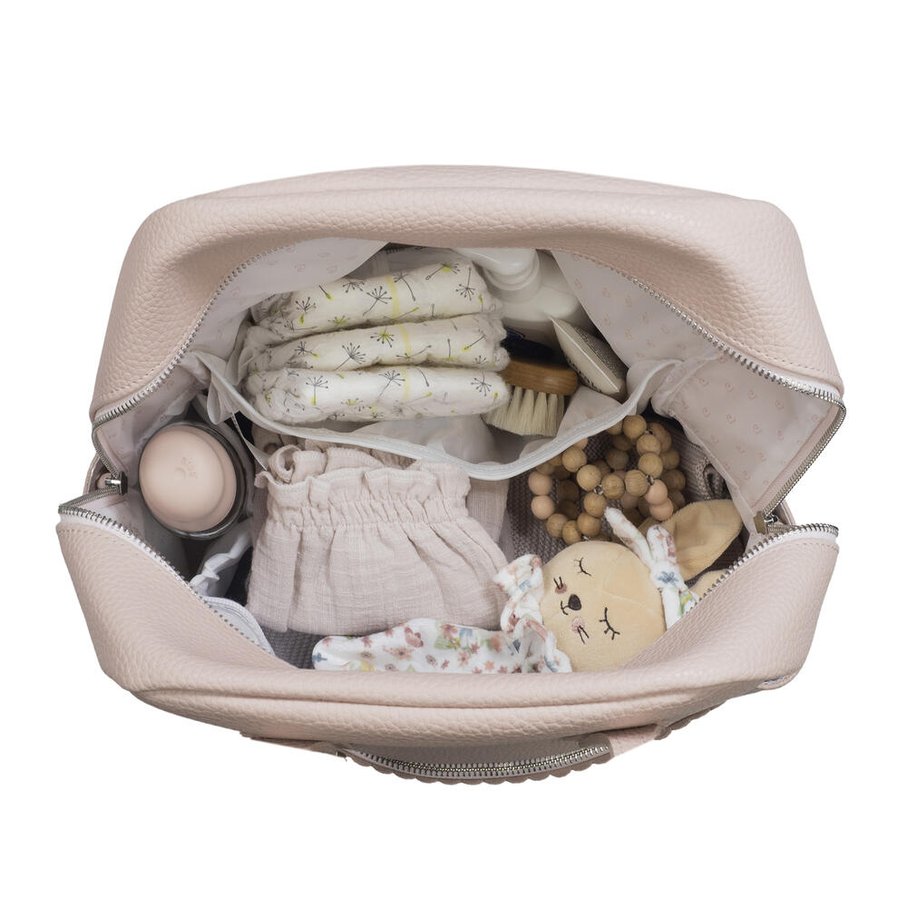 Elegante e prática mochila em polipele rosa com diversos compartimentos funcionais, espaço para todos os essenciais do bebé e um design elegante, perfeita para o dia a dia.