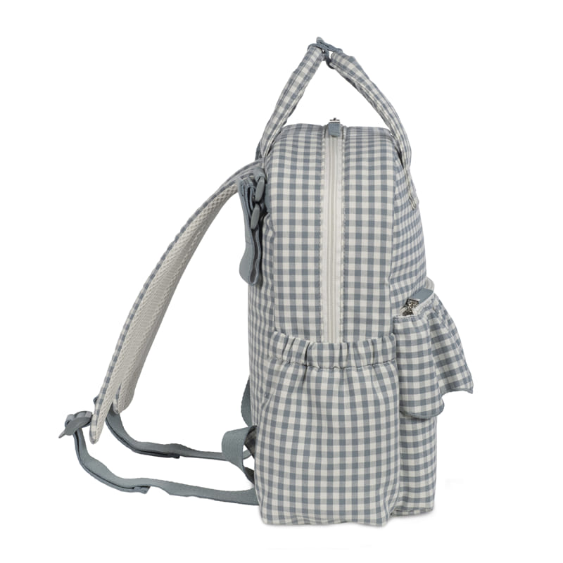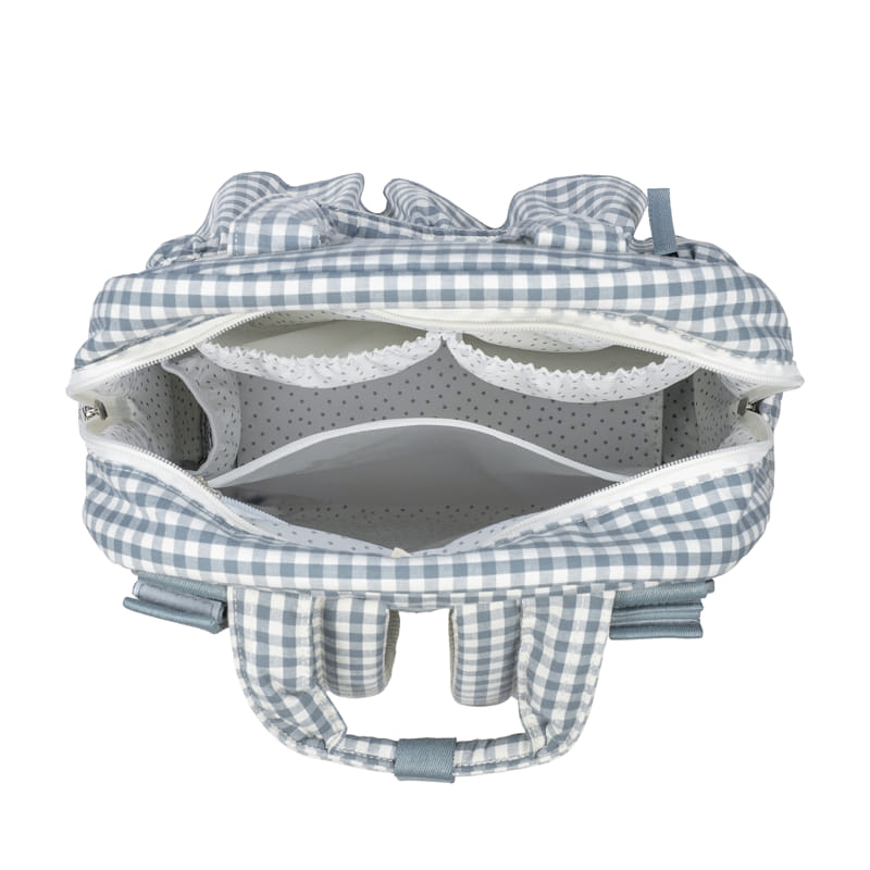 O design foi cuidadosamente pensado para oferecer máxima funcionalidade. No exterior, além do padrão vichy rosa, conta com um bolso frontal com fecho de correr e dois bolsos laterais ideais para biberões ou garrafas. No interior, inclui um bolso plastificado para roupa húmida, um bolso térmico para manter a temperatura dos biberões e divisórias adicionais para guardar pequenos objetos de forma prática.