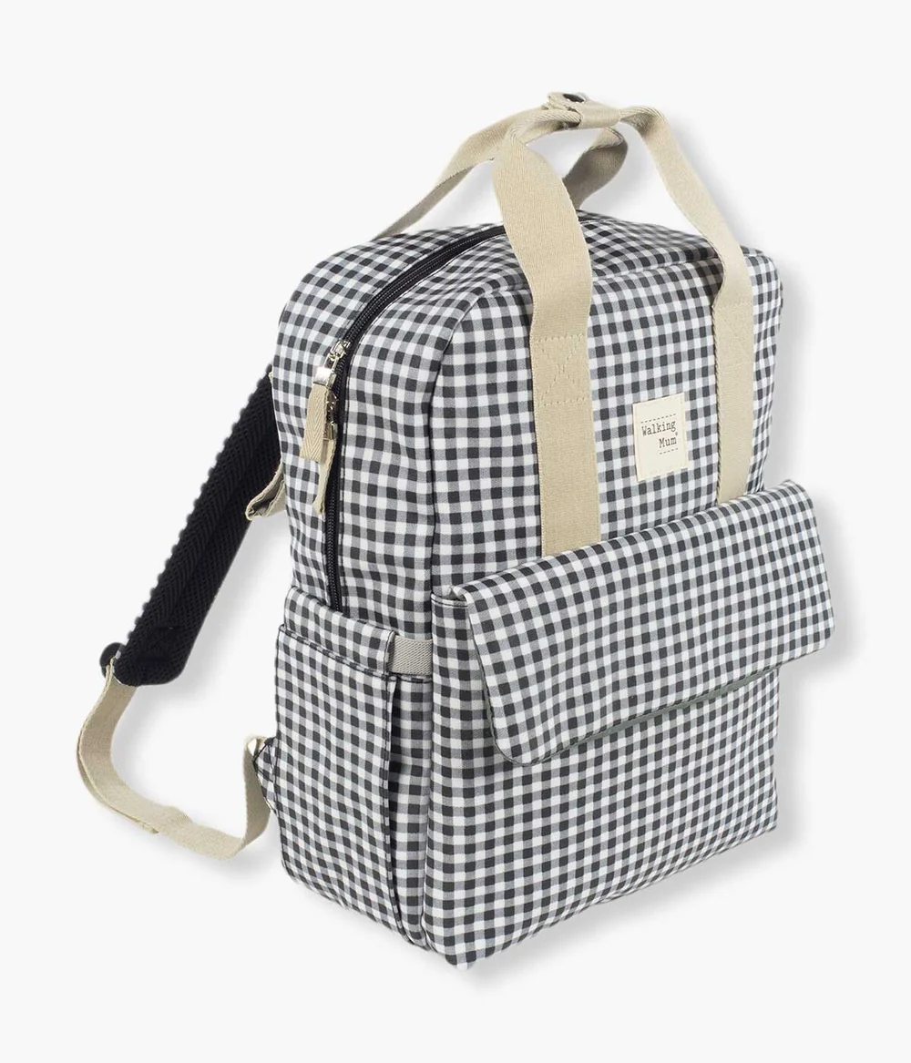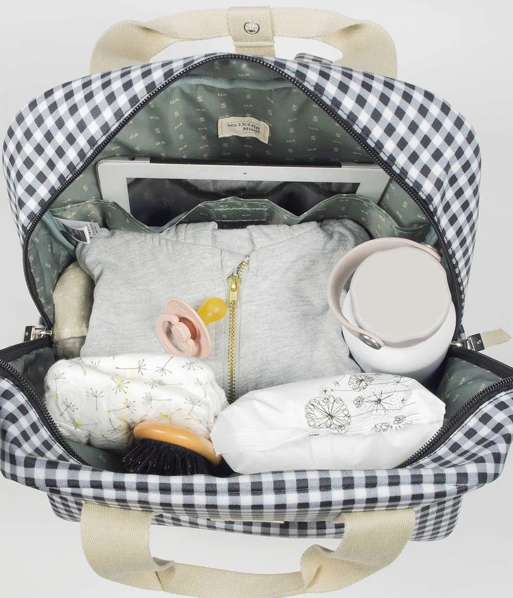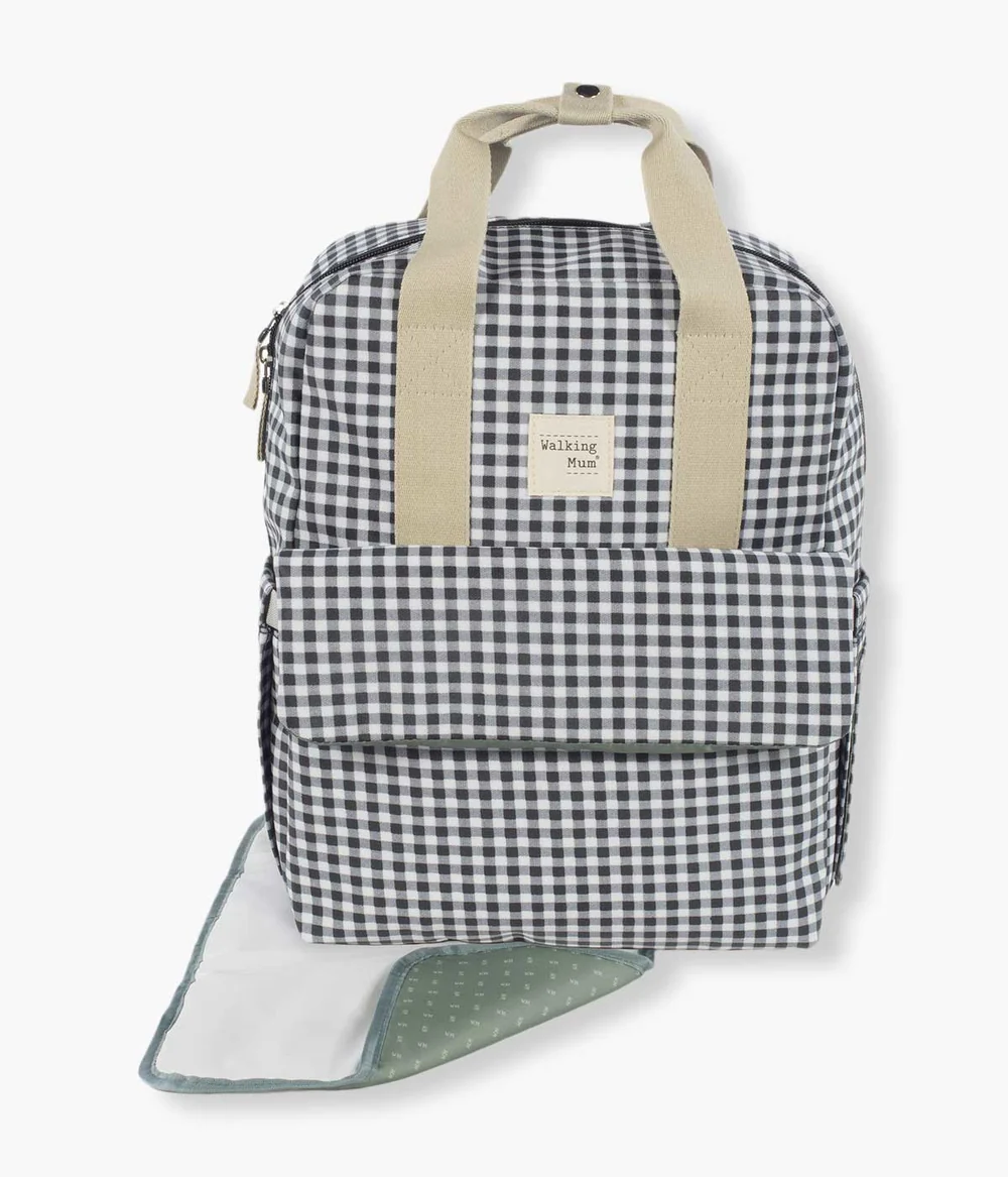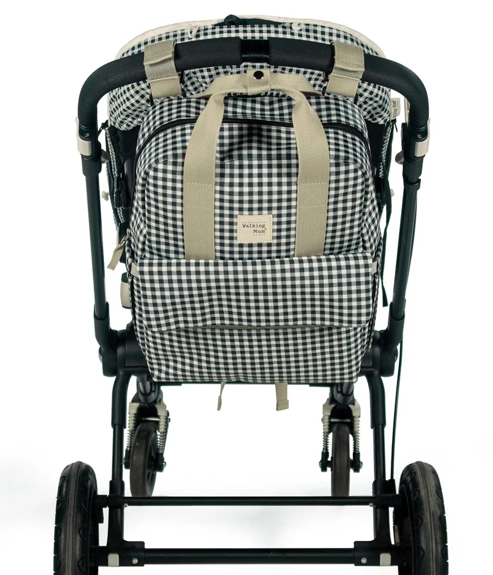 Prática mochila de maternidade Walking Mum I Love Vichy Black com padrão vichy preto.
