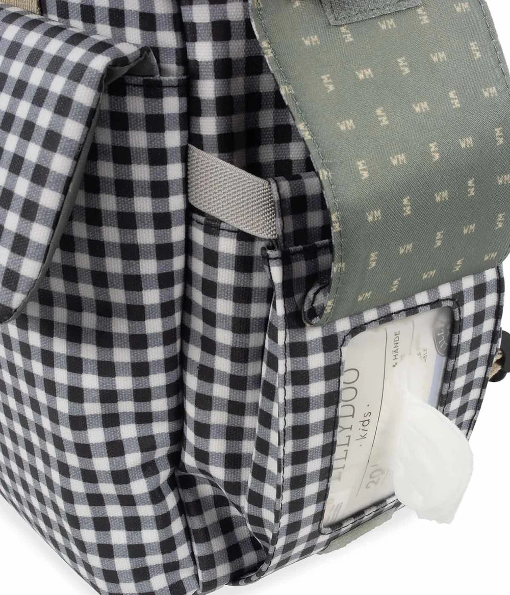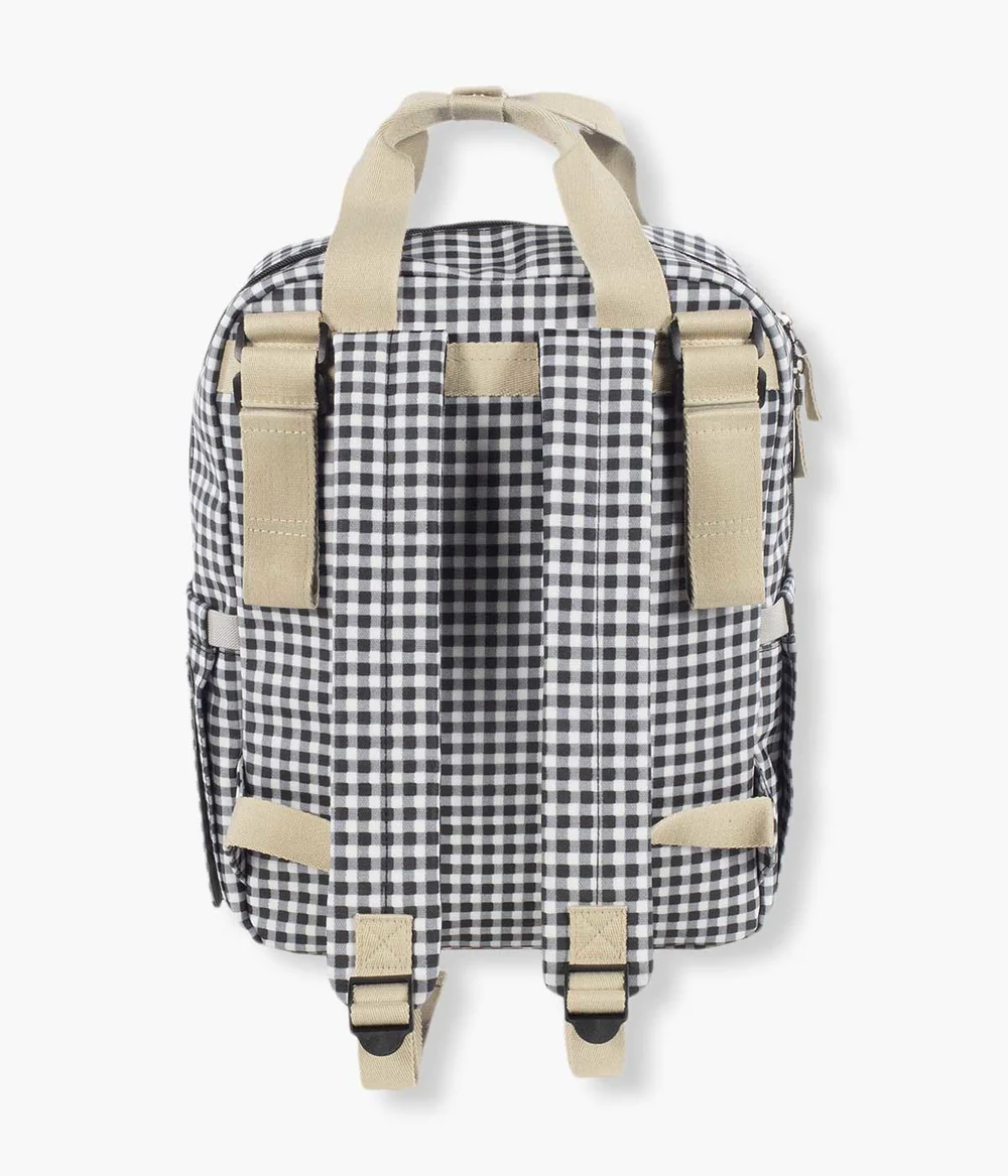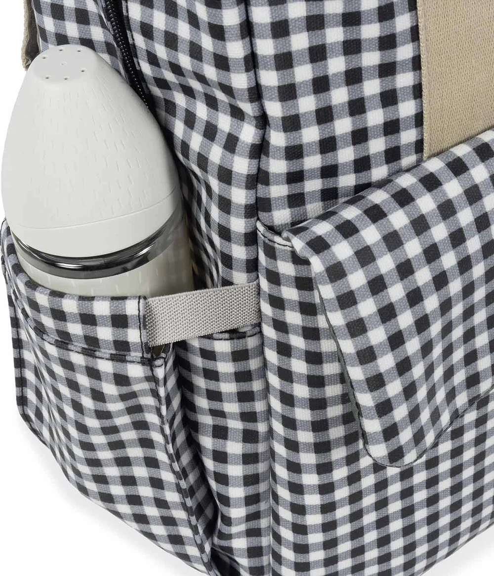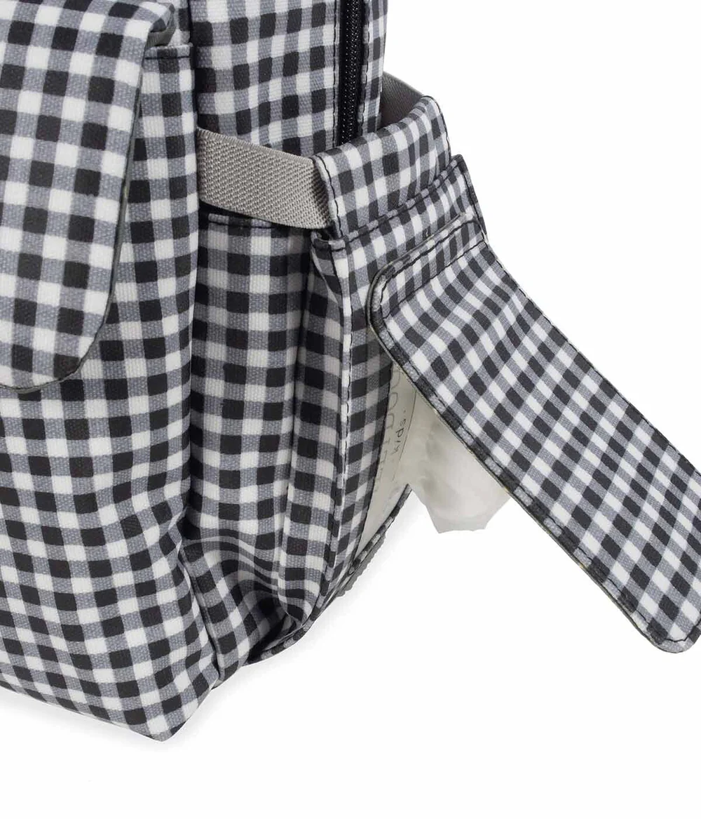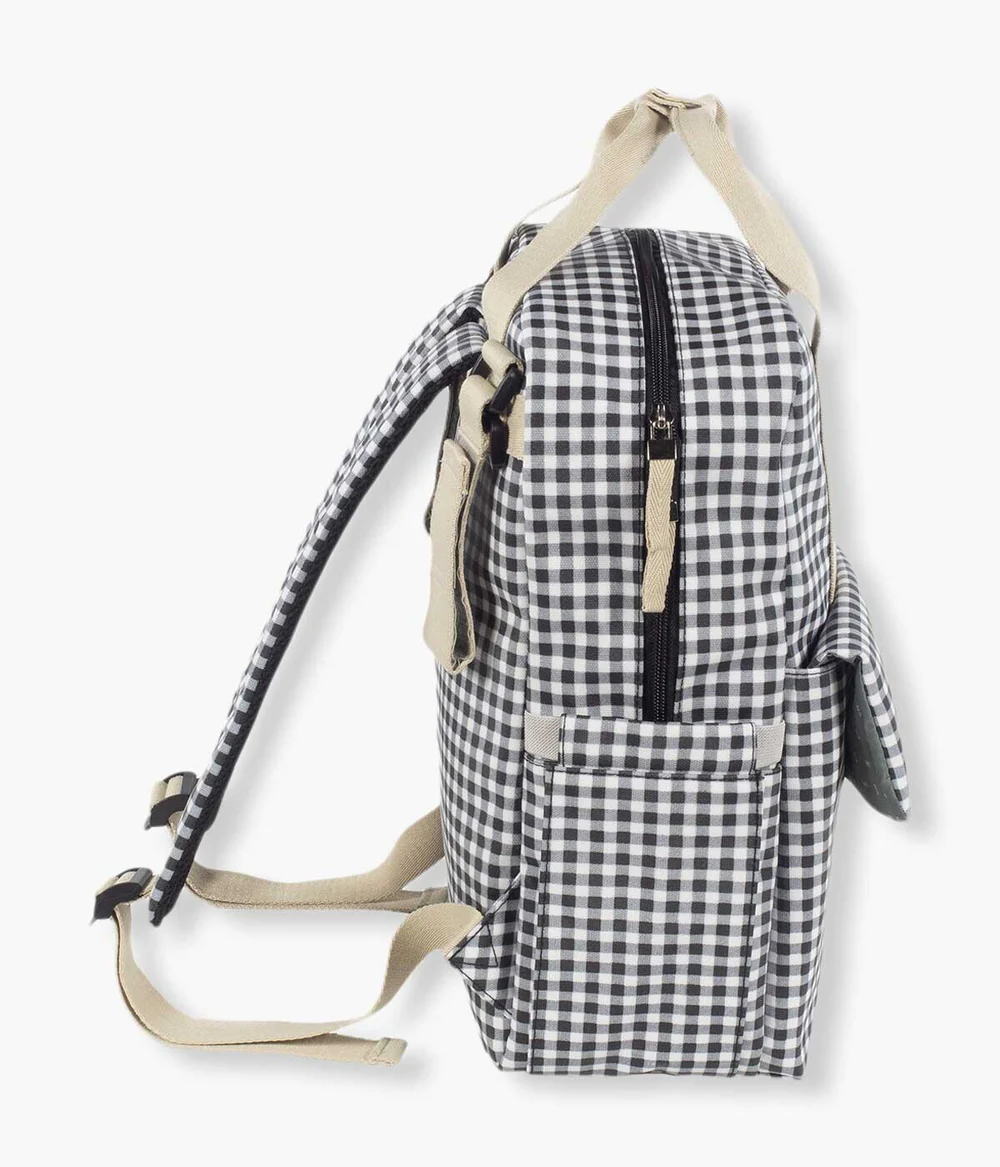 Prática mochila à prova de água com padrão vichy preto composta por diversos bolsos no interior e exterior.