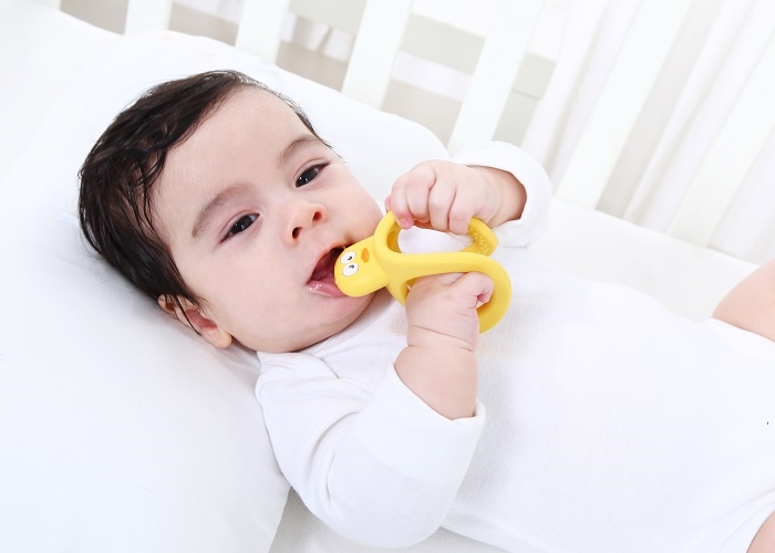 Mordedor fácil de segurar para acalmar e massagear as gengivas do seu bebé.