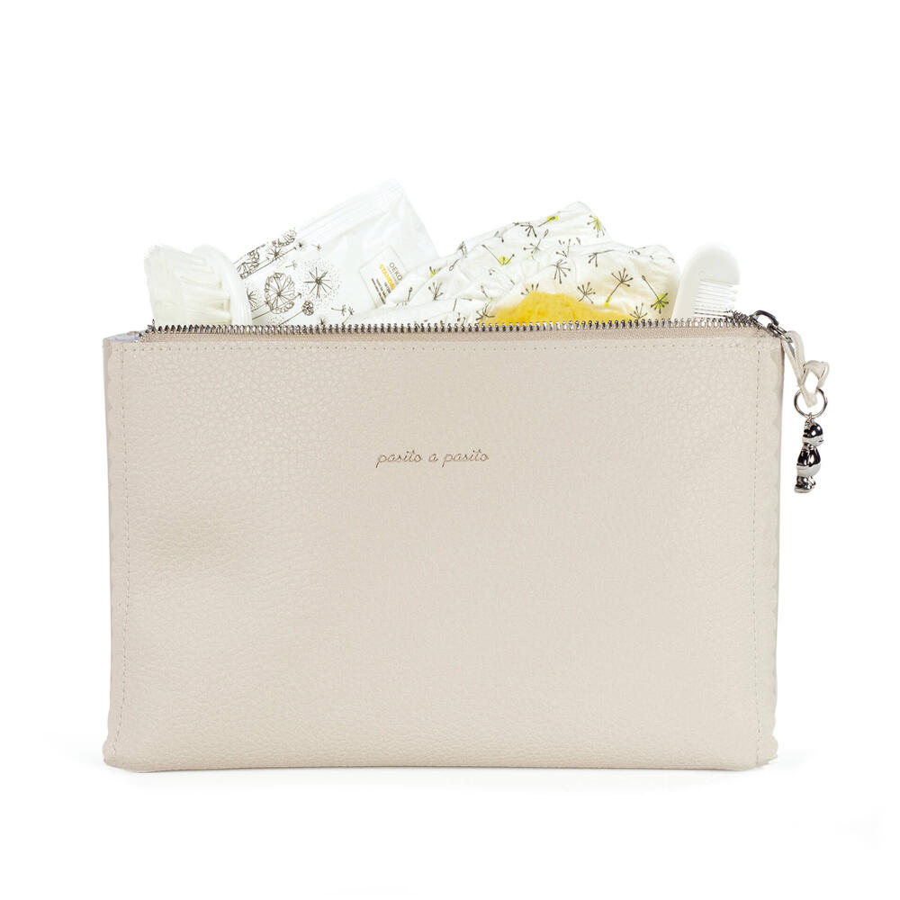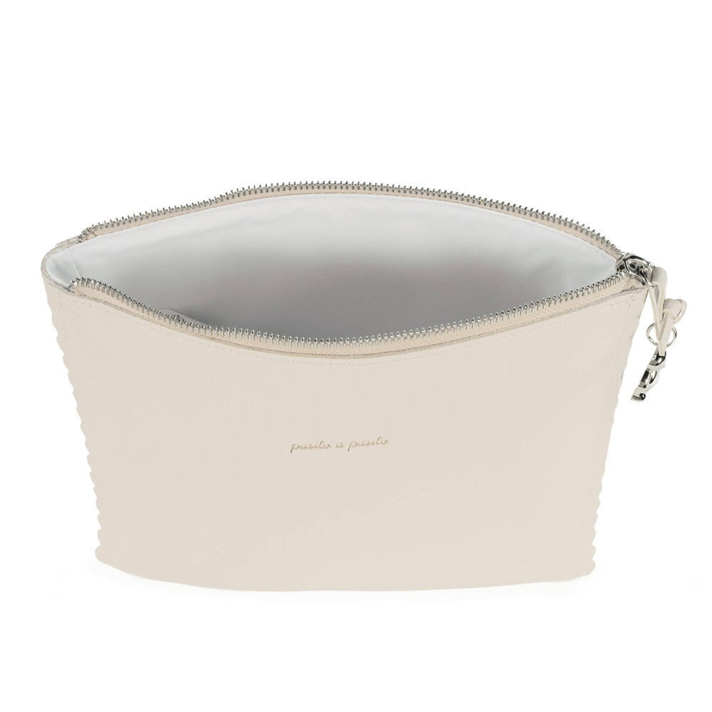 Feito em polipele creme durável e macio, o necessaire Icon Cream tem um formato que se encaixa perfeitamente no bolso lateral da mala de maternidade.