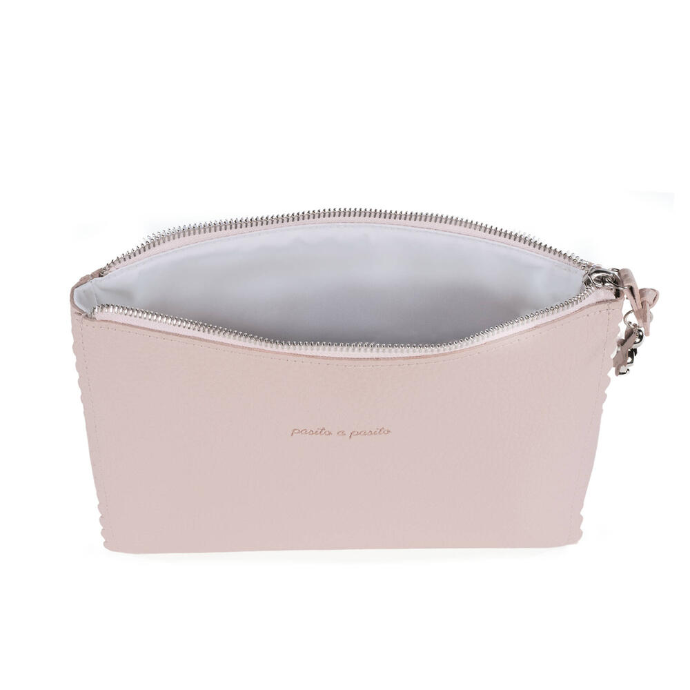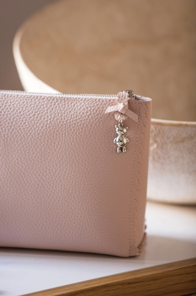 Elegante e compacta bolsa projetada especialmente para transportar todos os produtos de higiene do(a) bebé, com exterior em polipele resistente cor-de-rosa e interior impermeável.