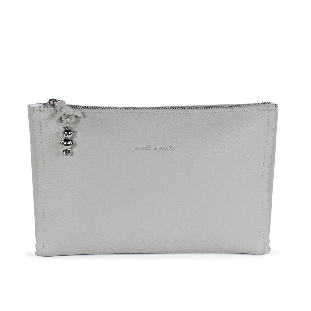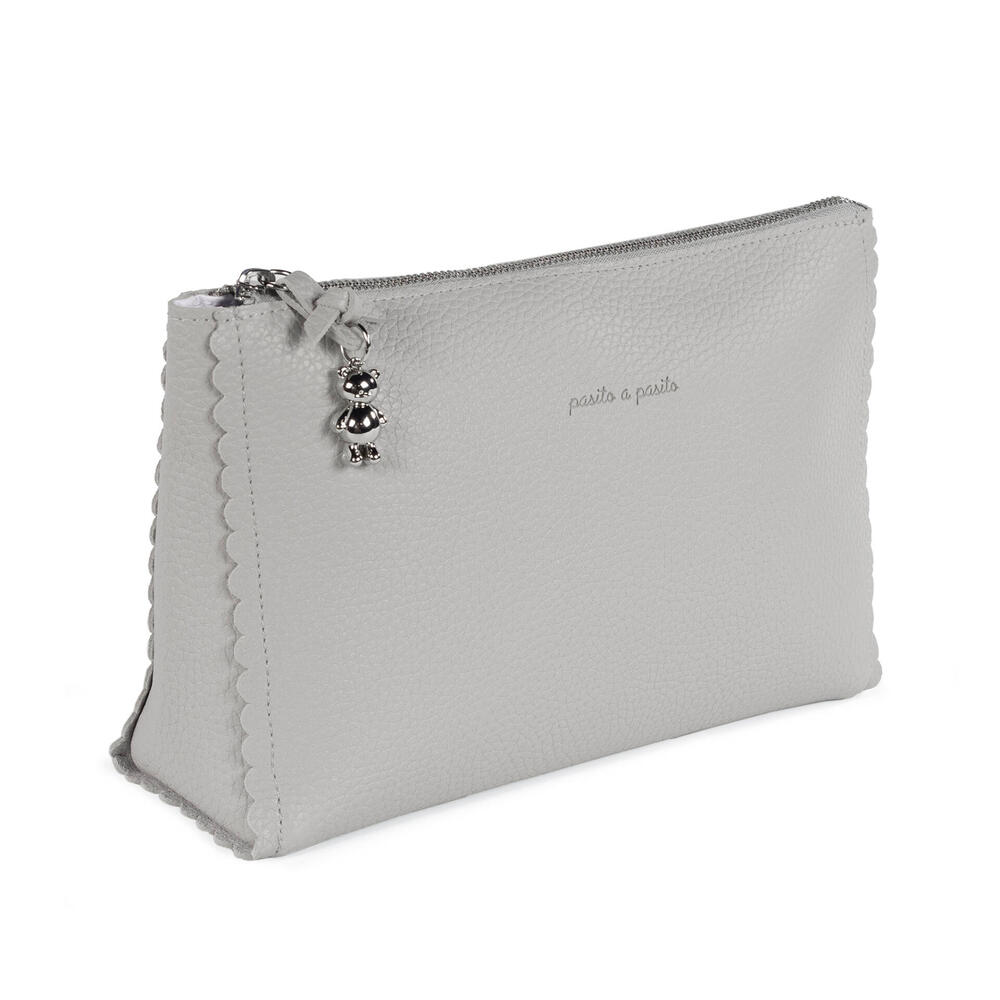 Feito em polipele cinza durável e macio, o necessaire Icon Smoke tem um formato que se encaixa perfeitamente no bolso lateral da mala de maternidade.