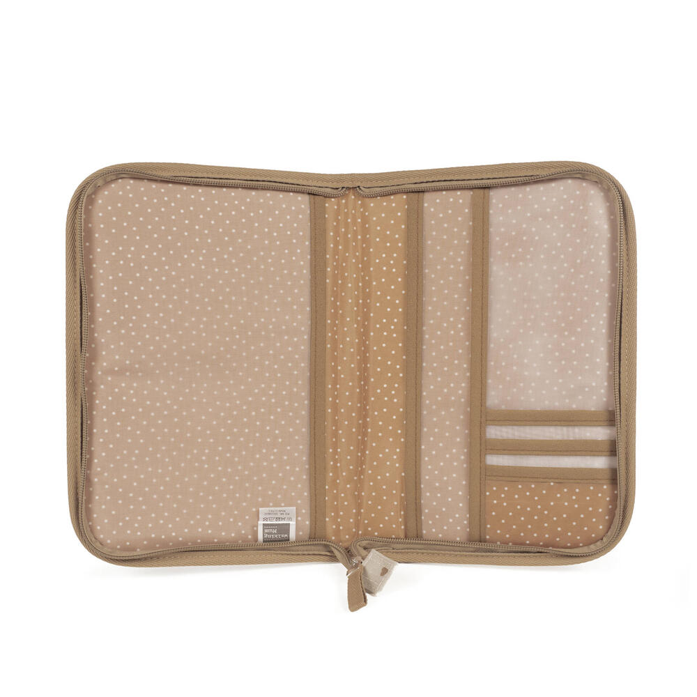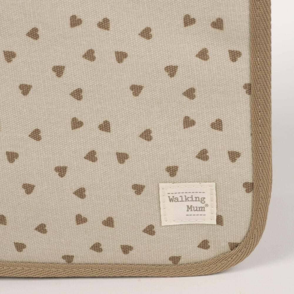 Porta Documentos Walking Mum Hearts Poppy Cinnamon bege com padrão corações cor canela composto por divisórias para organizar todos os documentos do bebé.