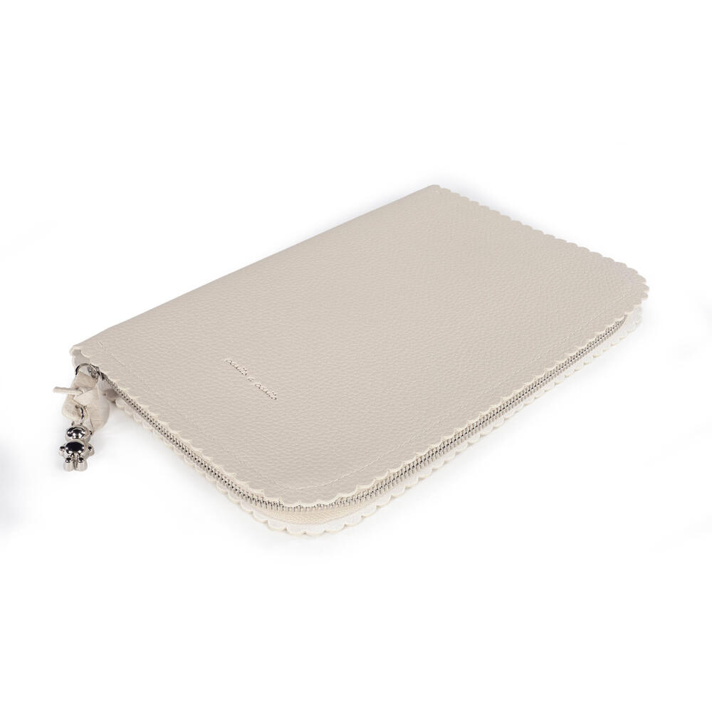 Elegante porta documentos em polipele creme com rebordo ondulado composto por diversas divisórias para organizar todos os documentos da bebé e não só.
