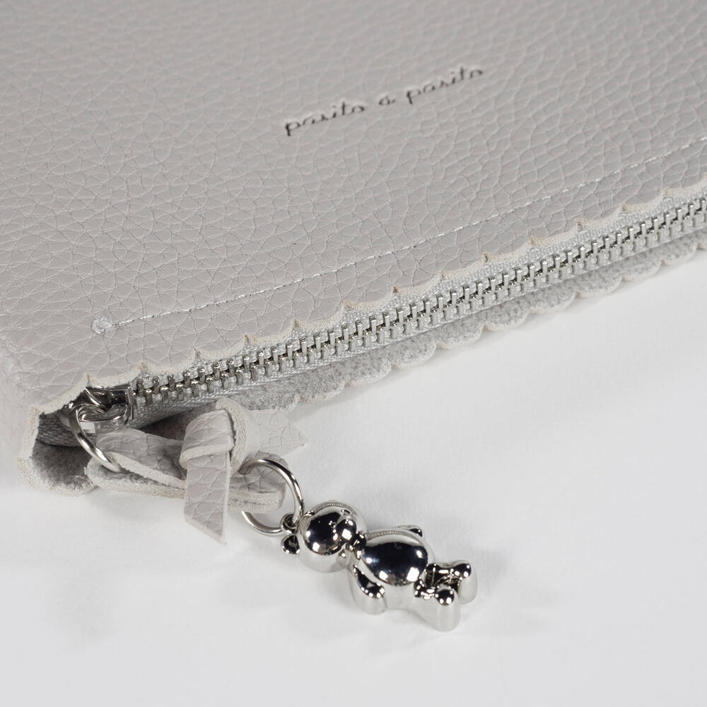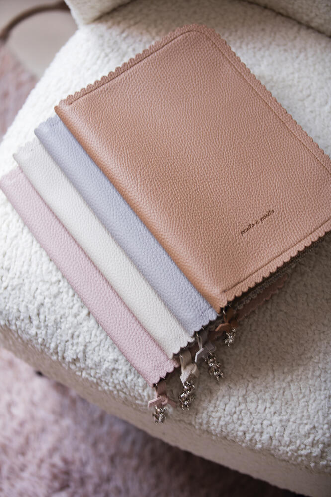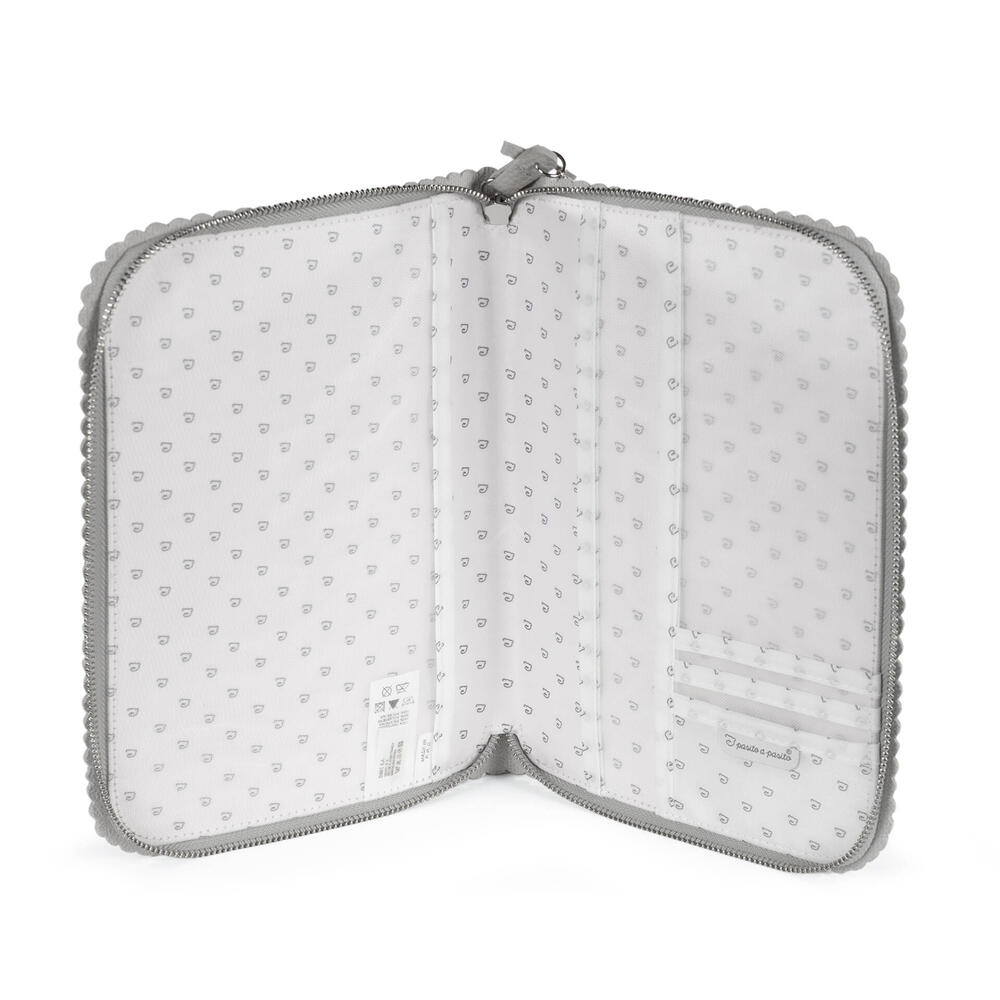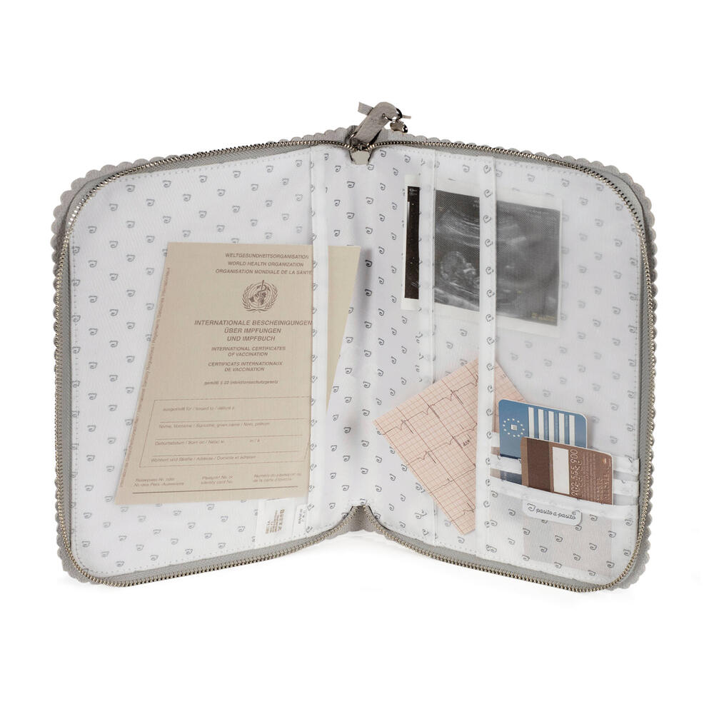 Elegante porta documentos em polipele cinza com rebordo ondulado composto por diversas divisórias para organizar todos os documentos da bebé e não só.