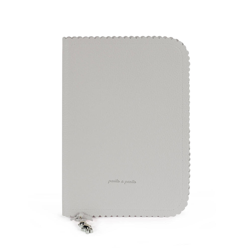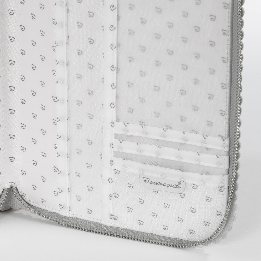 Porta documentos em couro sintético estilo livro para bebé menino(a) com logo e pendente Pasito a Pasito com forro acetinado.